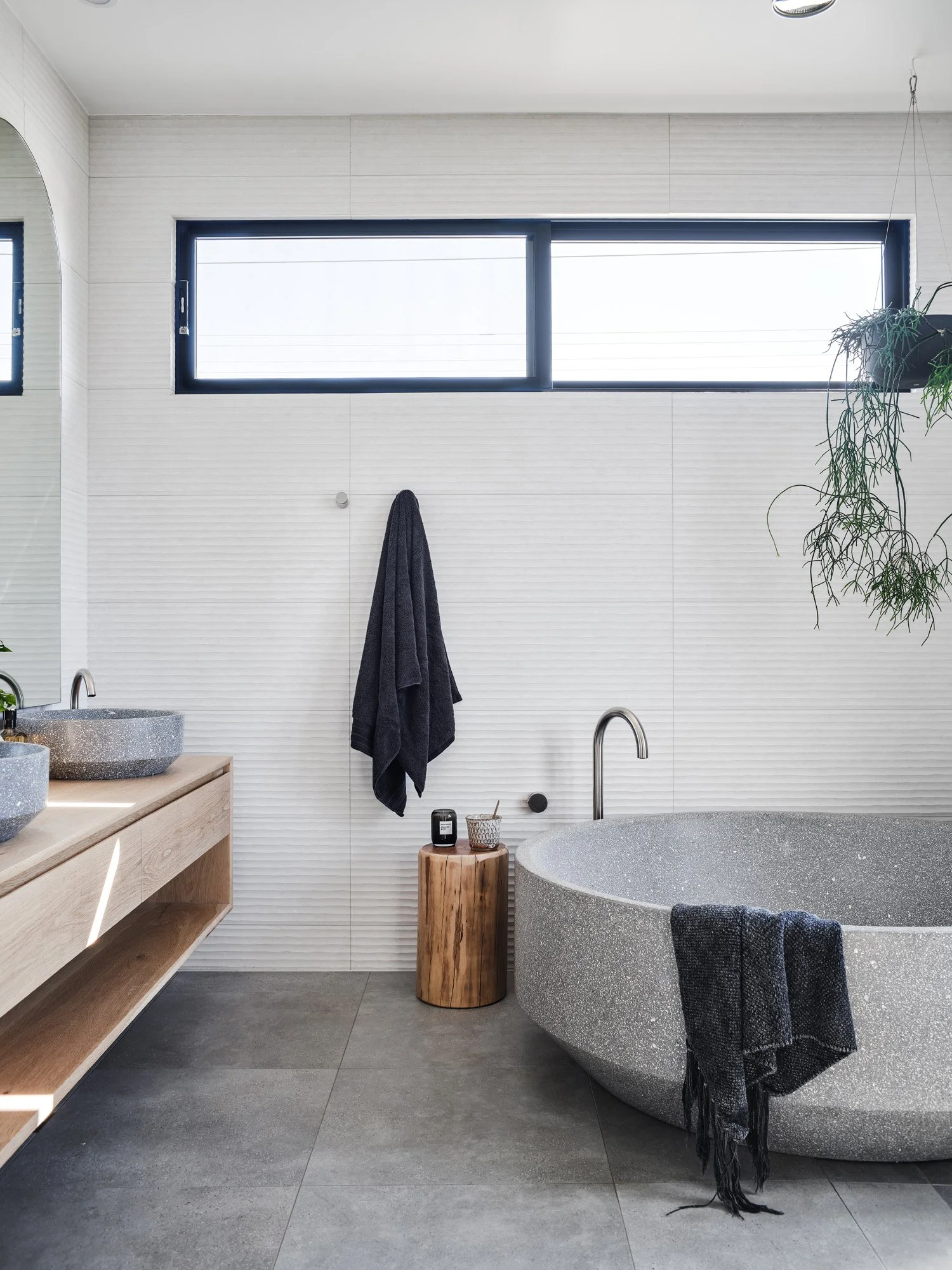 The master bedroom and ensuite at Barefoot Bay Villa are the epitome of laid-back luxury—a private sanctuary designed for rest, ritual, & retreat. In the bedroom, soft, layered textures meet a muted coastal palette, with natural timber details & custom joinery creating a sense of calm & effortless sophistication. The ensuite continues the story with an indulgent, spa-like atmosphere—brushed brass tapware, and generous proportions that balance function with feeling. A statement freestanding bath & walk-in shower sit within a space that feels grounded yet elevated, connected to the landscape but entirely your own.
