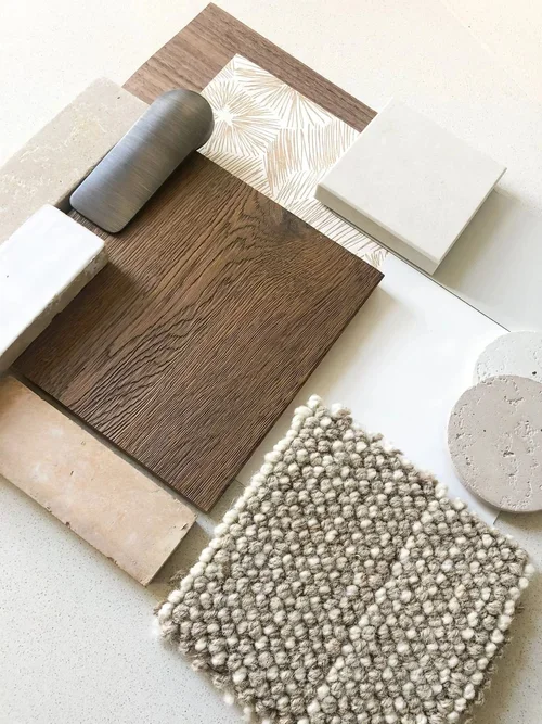 Arrangement of various sample materials on a wooden table, including tiles, fabric swatches, and color samples, with hands pointing towards the samples.