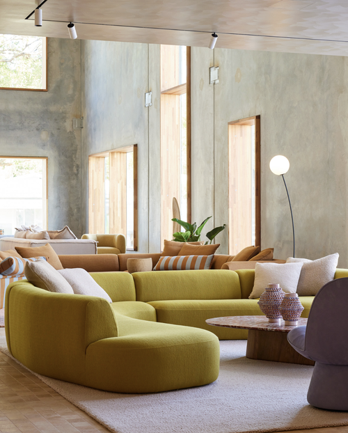 A modern living room with a large mustard-colored sofa, a low wooden coffee table, and multiple patterned pillows. There is a tall, white floor lamp, a pink textured rug, and large windows with wooden trim that let in natural light. A green plant is near the windows and the walls are textured with a concrete finish.