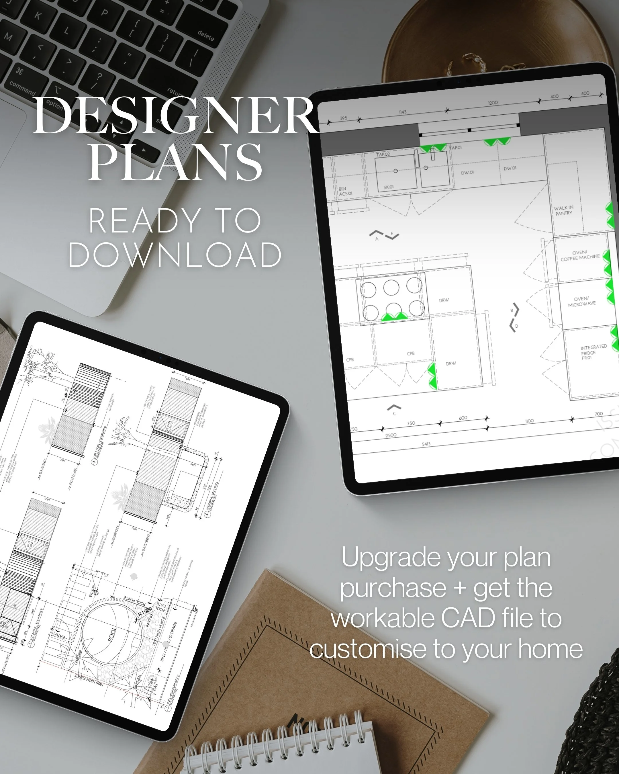 Once downloaded each plan is flexible and ready to adapt. If you want more than just a detailed guideline, upgrade to receive the editable CAD drawing file, giving you (or your builder/designer) full control to customise dimensions, layouts, and details to perfectly suit your home. Need help with drafting the changes or just that final eye from a Designer? We’re here to help – just purchase the Edit The Design pack, book a Design Intensive with Mel or send us a message.