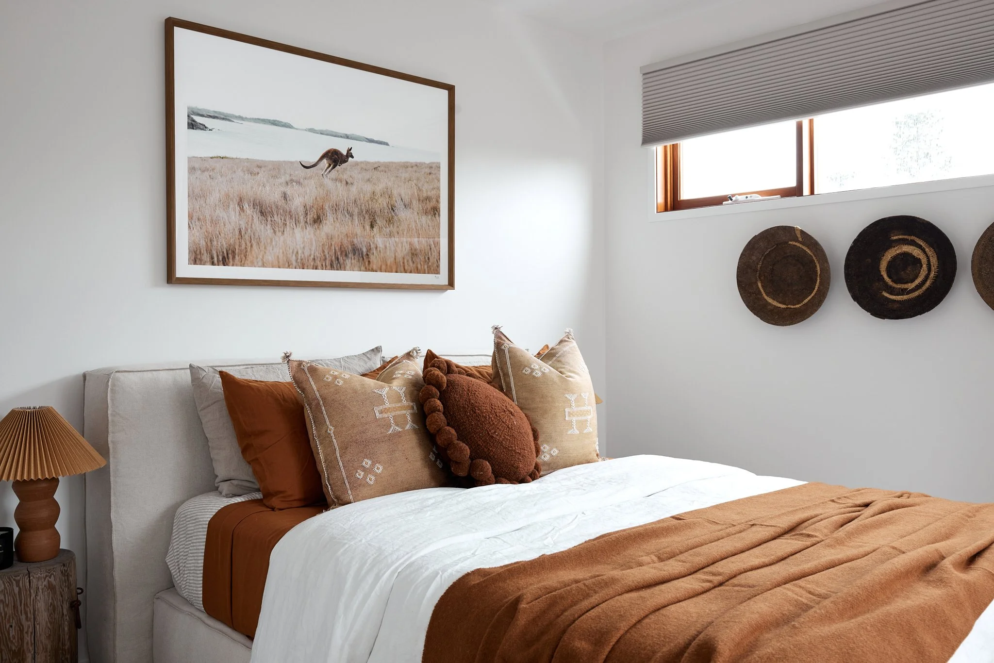 The master bedroom at Samudra House is a true sanctuary of rest and rejuvenation. Anchored by a luxurious king-size bed, the space opens onto a private balcony that frames a breathtaking view of the towering gum tree canopy—inviting nature in with every sunrise. A spacious walk-in robe offers refined functionality, while the beautifully appointed ensuite completes the retreat with a sense of calm, contemporary luxury. It’s a space designed to restore, unwind, and reconnect.