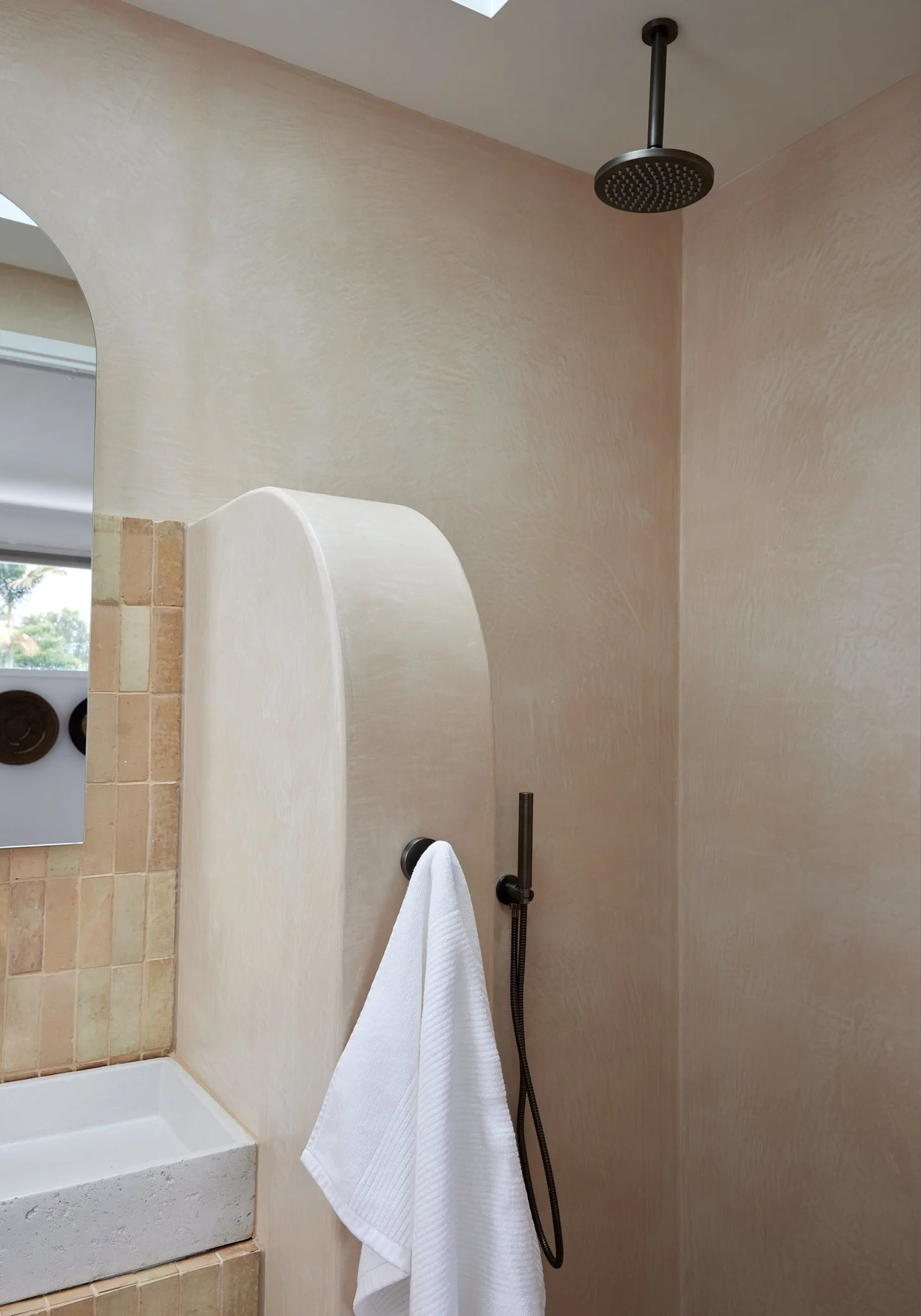 The bathrooms at Samudra House are a tactile, tonal dream—where every surface invites touch and calm. Curved details soften the architecture, while microcement walls and heavily textured tiles add depth and dimension in the most subtle, sophisticated way. Rendered entirely in neutral tones, these spaces feel serene yet sculptural, creating a spa-like experience that blends minimalism with organic warmth. It's everyday ritual, elevated.