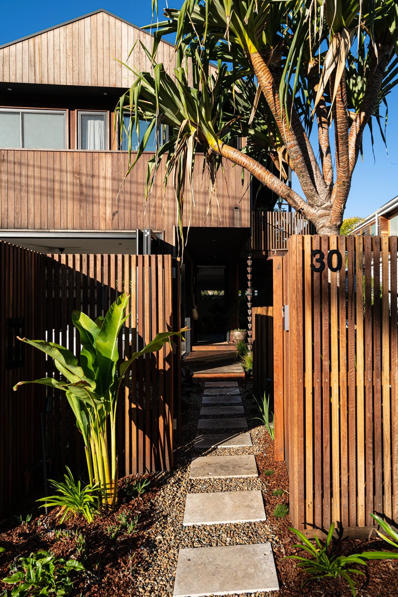 Lovingly known as Sikata House, this Byron Bay home takes its name from the Sanskrit word for “sand”—a fitting tribute to the raw beauty of its natural surrounds. The exterior palette is inspired by the earthy tones of nearby beaches, sun-drenched clifftops, and native bushland, creating a seamless connection between the home and its coastal environment. Rich timber cladding wraps the structure in warmth and texture, giving it an inviting, grounded presence. It’s a design that celebrates simplicity, nature, and the Australian landscape in every detail.